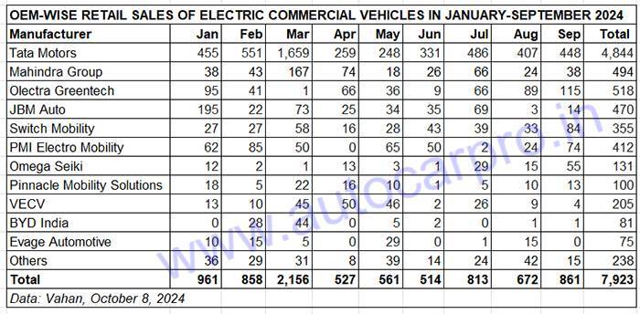 In terms of OEM retails which constitutes combined sales tally of goods carriers and passenger-transporting buses, Tata Motors is the strong e-CV market leader with 448 units in September (comprising 271 light goods carriers and 177 e-buses) and 4,844 units in January-September 2024 (comprising 1,235 buses). This performance gives Tata Motors a market share of 52% in September and 61% in January-September.
