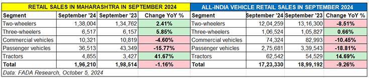Commenting on how September 2024 performed, FADA Maharashtra State Chairperson, Sachin Vasantrao Mahajan said, “There has been a significant decline in PV sales followed by CV sales which have fallen as compared to last year. Good rainfall in the month of September has boosted tractor sales and have shown some excellent retails. The 2W and 3W segment has not been able to show noticeable grow in spite of the Ganpati festival. There has been an overall degrowth as compared to last year.”
