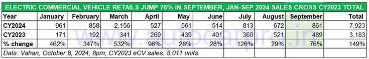 Demand for electric commercial vehicles in India is on the rise and cumulative nine-month sales between January-September 2024 at 7,923 units is a marked increase of 149% YoYv (January-September 2023: 3,183 units). Furthermore, the e-CV industry has already surpassed entire CY2023 sales of 5,011 units and could set a new record of over 10,000 units sold in CY2024.