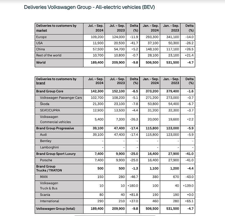 The Volkswagen Group has sold 6.52 million vehicles (6,524,300 units) worldwide after three quarters of CY2024, down 2.8% on the previous year (January-September 2023: 6.72 million vehicles). Of this total, sale of battery electric vehicles (BEVs) comprised 506,500 units, down 4.7% in the previous year-ago period (531,500 vehicles) and contributed 7.76% to global VW Group sales in the first nine months of this year.