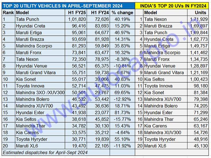 The compact SUV segment, which accounted for 671,674 units or exactly 50% of the total 13,43,363 UVs sold in the April-September period, also lords over the Top 20 best-selling UVs in H1 FY2025. Starting from the No. 1 model, the Tata Punch, there are all of nine models whose combined wholesales of 592,179 units make up the same ratio – 50% of the total 11,74,122 units these Top 20 models have sold in the first six months of FY2025.