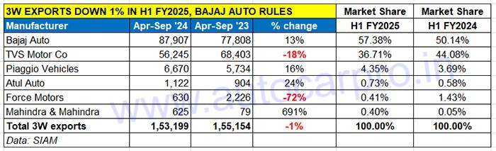 Piaggio Vehicles, with 66,70 units, has registered a 16% YoY increase and sees its market share rise to 4.35% from 3.69% in H1 FY2024. Atul Auto has also delivered a good performance with 1,122 units, up 24% YoY as has Mahindra & Mahindra which, at 625 units exported, shipped 546 additional three-wheelers than it did a year ago.