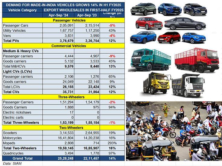 Demand for made-in-India vehicles has risen by 14% in the April-September 2024 period to 25,28,248 units (H1 FY2024: 22,11,457 units).
