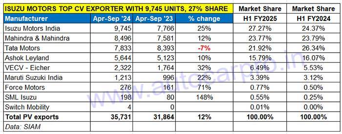 Interestingly, as per SIAM data, Isuzu Motors India with 9,745 units and strong 25% growth, is currently the No. 1 CV exporter. Isuzu’s market share has risen to 27% from 24% a year ago and is 6,584 units away from bettering its FY2024 exports of 16,329 units.