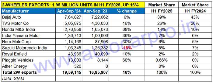 India Yamaha Motor, which was ranked fifth in Q1 FY2025, has moved to No. 4, ahead of Hero MotoCorp with 136,713 units, up 36% YoY. The bulk of its exports comprised bikes – 1,02,989 units, up 23 percent. The key volume contributors were the FZ and SZ (57,860, up 38%) Crux (24,670, up 52%). Export demand for Yamaha scooters doubled – the 33,724 units in H1 FY2025 were up 100% YoY and comprised 33,544 Fascino and Ray and 180 Aerox.