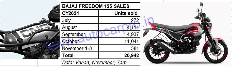 Demand for the Bajaj Freedom 125, the world’s first CNG-powered motorcycle launched on July 5, 2024, rose to a best-ever monthly stat of 11,041 units retailed in the festive month of October 2024. As per Vahan data (as of November 4, 7am), cumulative sales of the Freedom 125 are 20,942 units comprising 272 units in the last two weeks of July, 4,111 units in August, 4,937 units in September, 11,041 units in October and 581 units in the first three days of November.