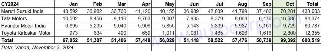 This mega performance in October has resulted in the combined sales of India’s four CNG PV manufacturers in the January-October 2024 period registering a total of 607,287 units, an increase of 43% YoY (January-October 2023: 426,014 units). With two months left to go for 2024 to come to an end, expect the CNG PV industry to set a new annual retails sales benchmark of over 700,000 units, which will be a 32% YoY increase.