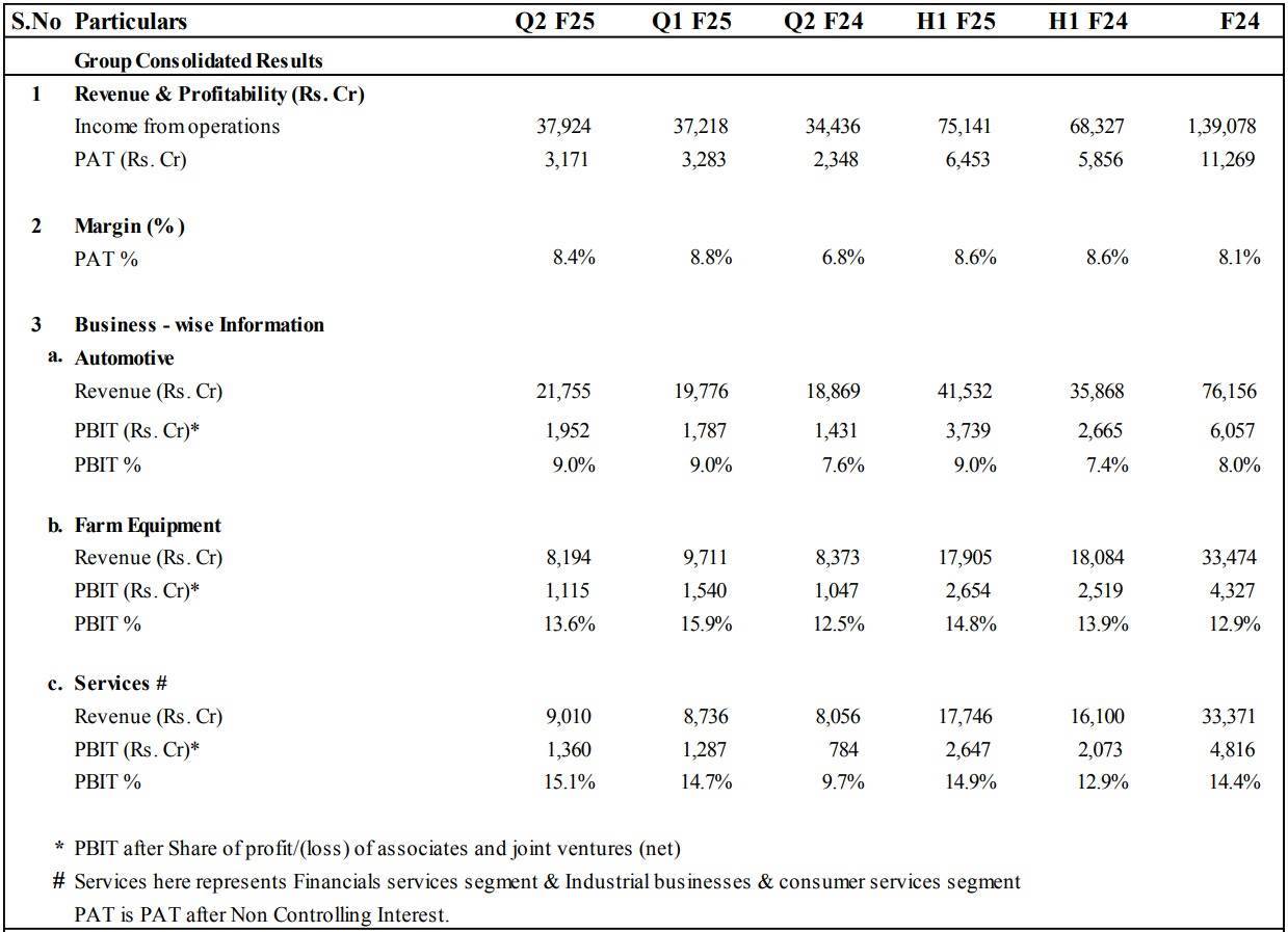 On a consolidated basis, Mahindra & Mahindra reported a robust performance for the second quarter of fiscal year 2025, with consolidated profit after tax surging 35% to Rs 3,171 crore, driven by strong growth across its automotive, farm equipment, and services businesses.