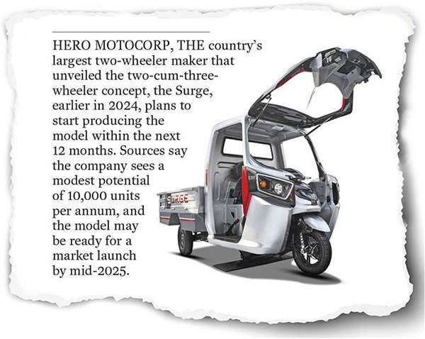 The all-electric Surge 32 by Hero MotoCorp is slated to enter series production within a year. This unique vehicle, which combines a two-wheeler and a three-wheeler, can now be registered under a newly created L2/L5 category. Sources say Hero MotoCorp foresees a modest potential of 10,000 units per annum, and the model may be ready for a market launch by mid-2025.