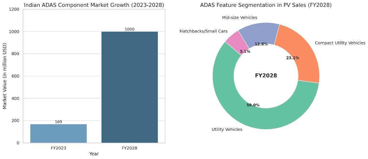According to industry analysis from CRISIL Market Intelligence and Analytics cited in the report, the Indian ADAS component market, valued at approximately USD 169 million in FY2023, is projected to reach around USD 1 billion by FY2028 – a sixfold increase. The report reveals that currently, passenger vehicles featuring ADAS account for nearly 2% of total PV sales in FY2023.