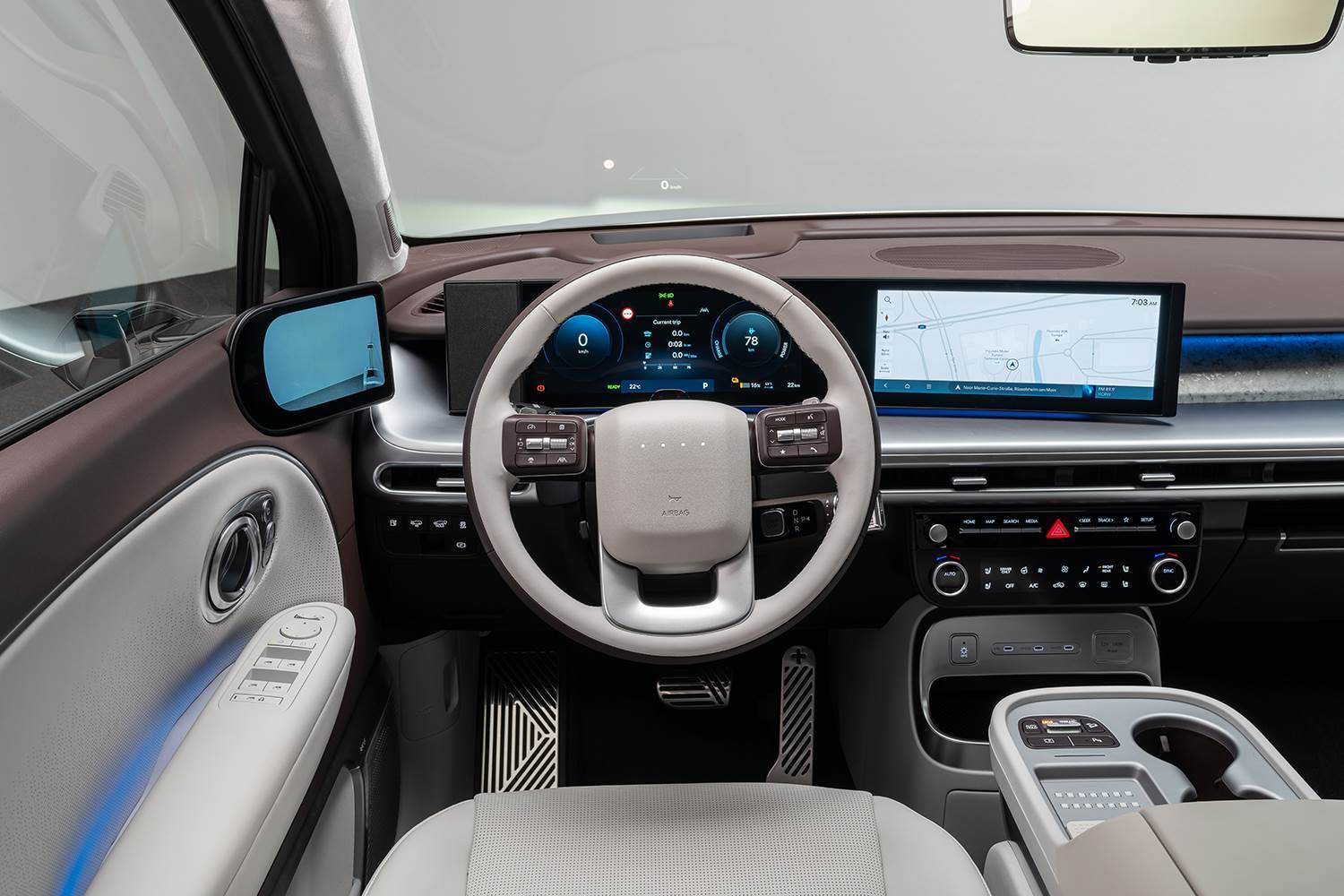 The cockpit is familiar from the other Ioniq models, with a one-piece panoramic curved panel mounted atop the dashboard for the driver display and infotainment screens, but a healthy smattering of physical buttons and switches left in place for key controls.