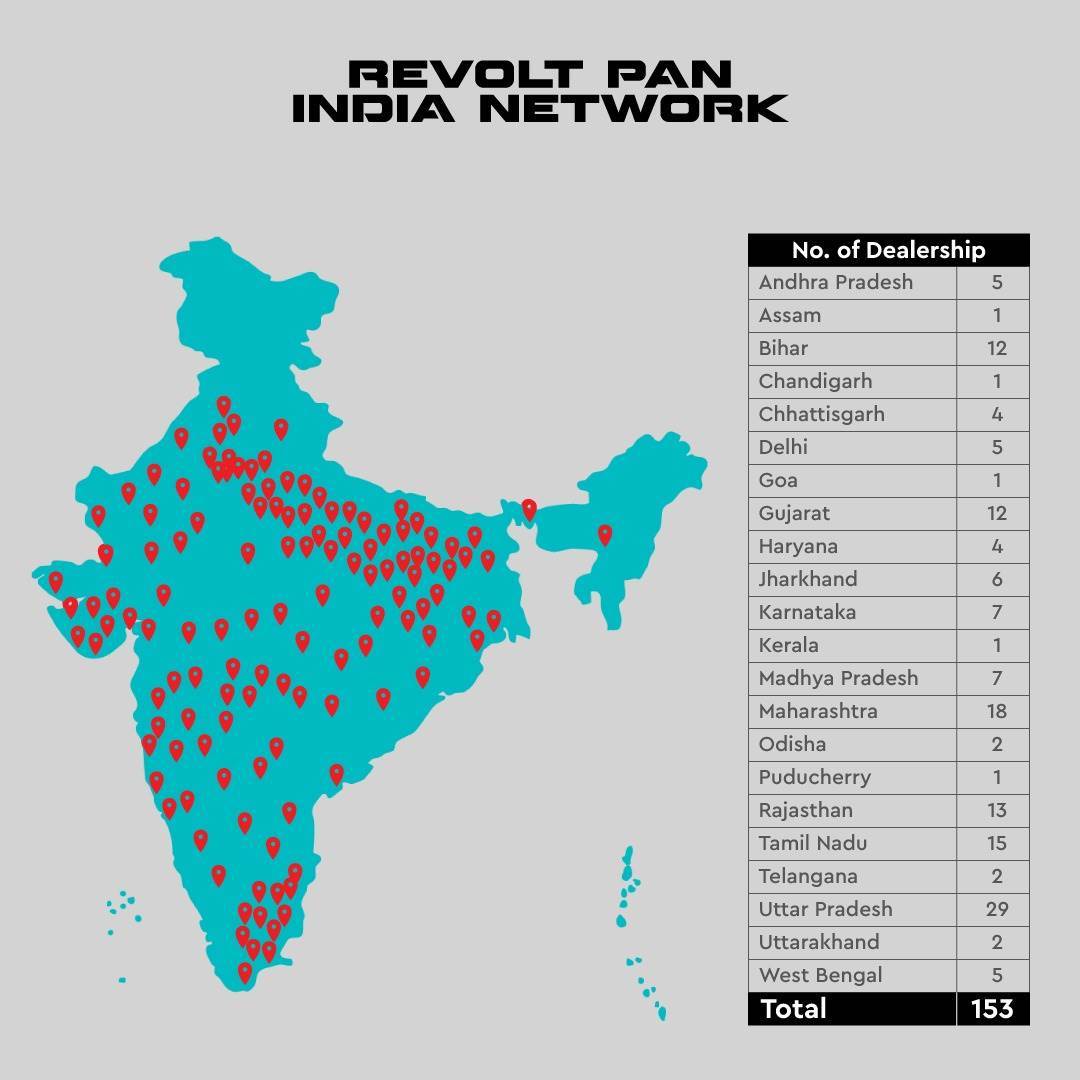 Revolt Motors, an electric motorcycle company in India, has expanded its dealership network, bringing the total number of locations to 153. Additionally, the company plans to open 14 more dealerships in November in cities such as Hubli (Karnataka), Muzaffarpur (Bihar), Katihar (Bihar), Maheshkhunt (Bihar), Khagaria (Bihar), Nawanshahr (Punjab), Kannauj (UP), Satara (Maharashtra), Sattur (Tamil Nadu), Mayiladuthurai (Tamil Nadu), Bhilwara (Rajasthan), Warangal (Telangana), Balasore (Odisha), and Bulandshahr (Uttar Pradesh).