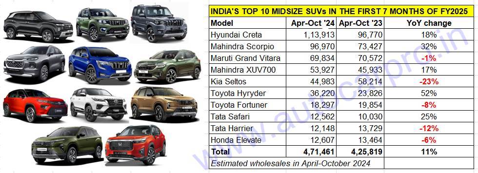 At 471,461 units, cumulative wholesales of the 10 best-selling midsize SUVs in April-October 2024 are up 11% YoY (April-October 2023: 425,819 units). However, while five models have registered strong double-digit YoY growth, the other five has seen their sales decline. Here’s looking at each of them in detail.