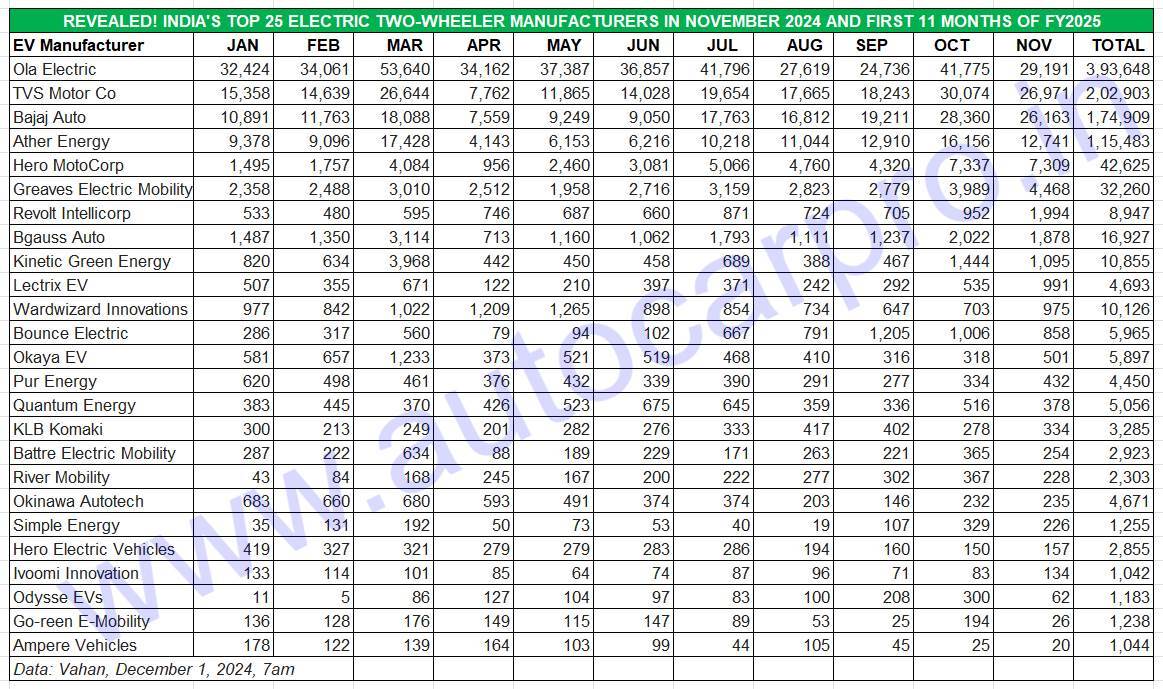 OLA ELECTRIC – November 2024: 29,191 units, down -3% YoY