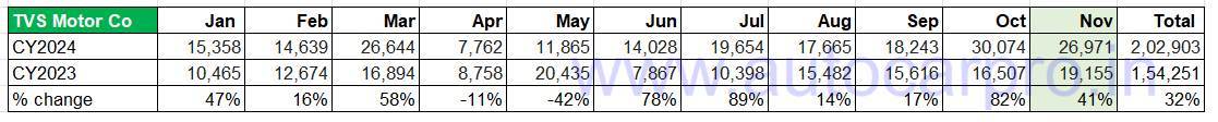 TVS MOTOR CO – November 2024: 26,971 units, up 41% YoY