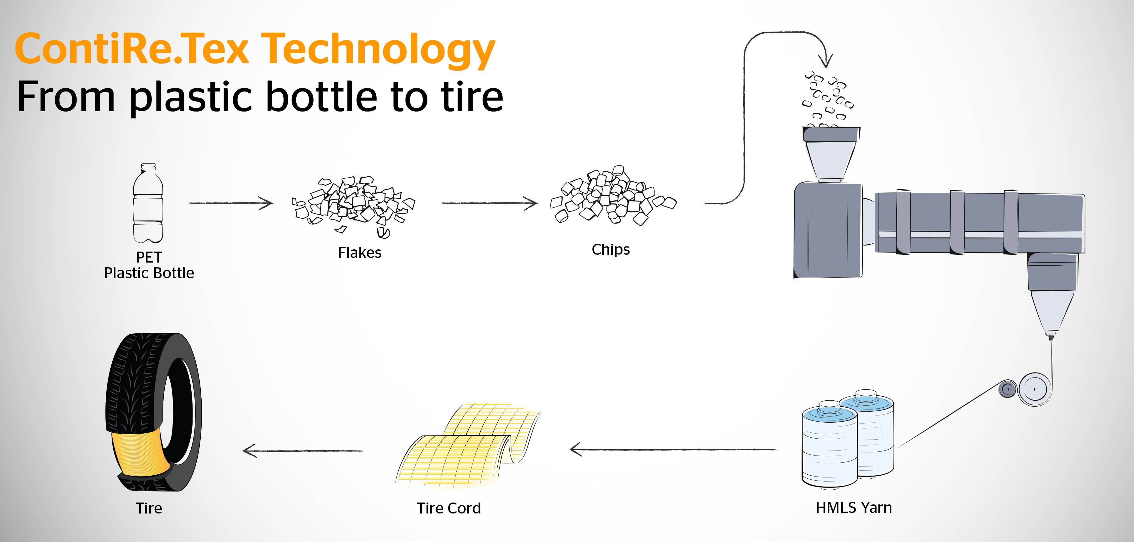 Recycled or renewable PET, with its tensile strength, toughness and temperature stability, is just as stable and suitable for tyre construction as conventional fabric made directly from crude oil. Continental is working intensively on various technologies to ensure that all types of polyester used in tire production can be converted to sustainable PET by 2030. In addition to recycled PET, the tyre manufacturer is also investigating the use of bio-based or chemically recycled PET.