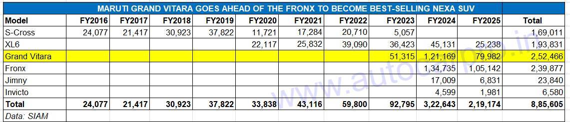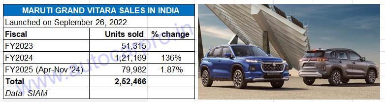 As per the latest industry data, the Grand Vitara has clocked total sales of 252,466 units including 79,982 units in the April-November 2024 period (see wholesales data table above).
