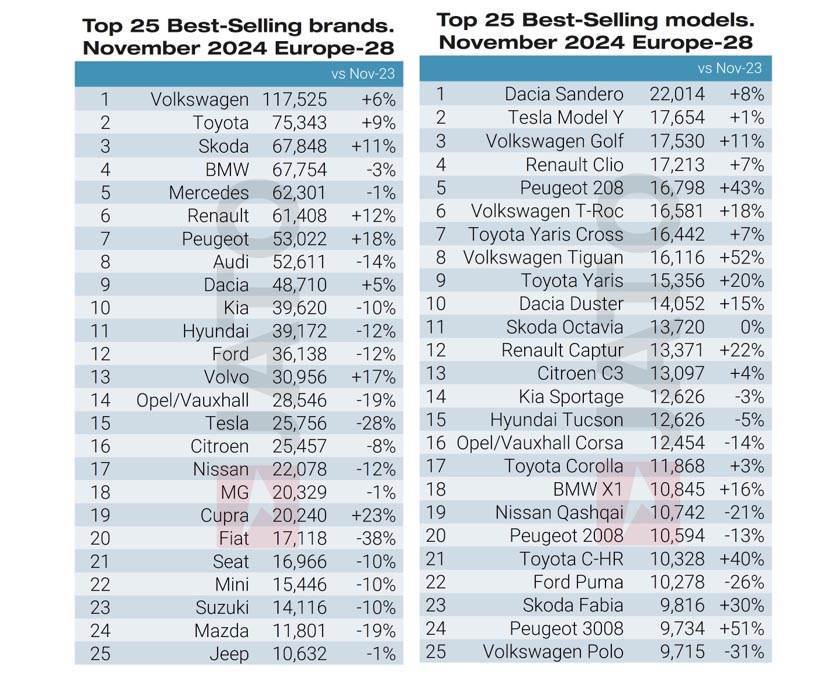November also saw significant changes from a brand perspective. Skoda occupied third position in the monthly rankings, thanks to strong sales of its Fabia, Enyaq and Kodiaq models. Volvo overtook Vauxhall/Opel, while both MG and Cupra surpassed Fiat, which recorded a 39% drop in registrations following the discontinuation of the gasoline-powered model of its Fiat 500. Elsewhere, Porsche outsold Land Rover, BYD registered more units than Honda, Omoda moved ahead of Subaru, and Xpeng registered more vehicles than Jaguar or Lancia.