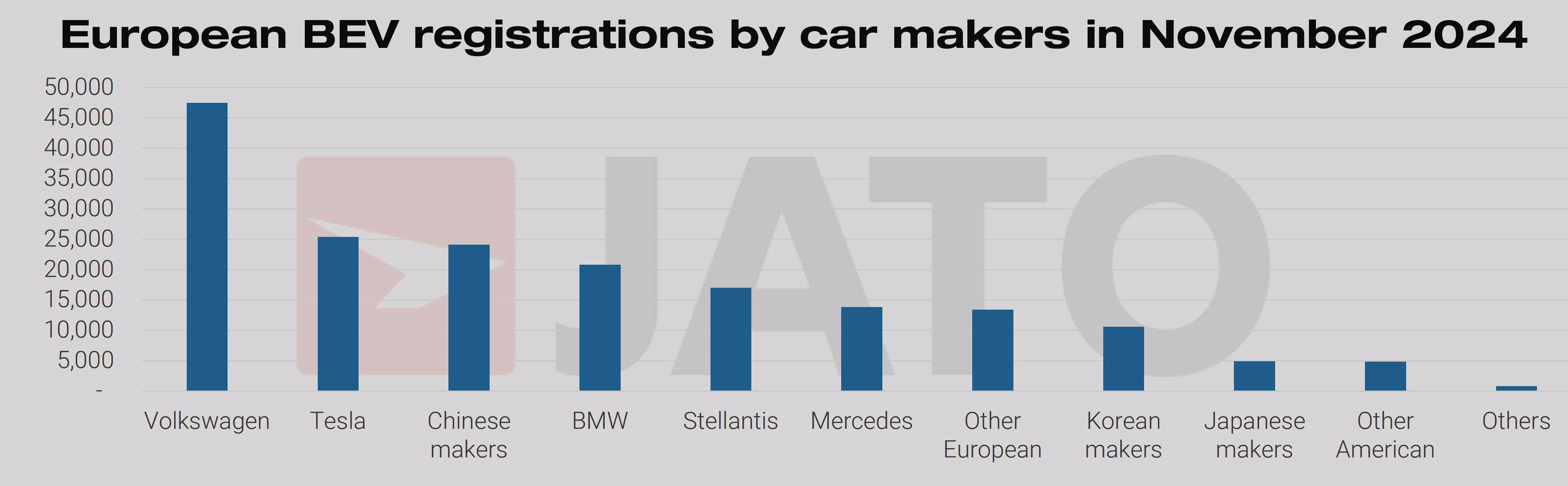 Tesla was the second largest seller of BEVs, followed by BMW Group and Stellantis, which occupied third and fourth place respectively. The standout performances of the month came from China’s automakers, which combined registered more than 24,100 units of BEVs in November (including Volvo, Polestar and Lotus), just behind Tesla. China’s automakers increased market share in the BEV category, from 12.5% in November 2023 to 13.2% last month. Growth was driven by Leapmotor (+296%), BYD (+127%), Xpeng (+93%) and Geely (+33%).
