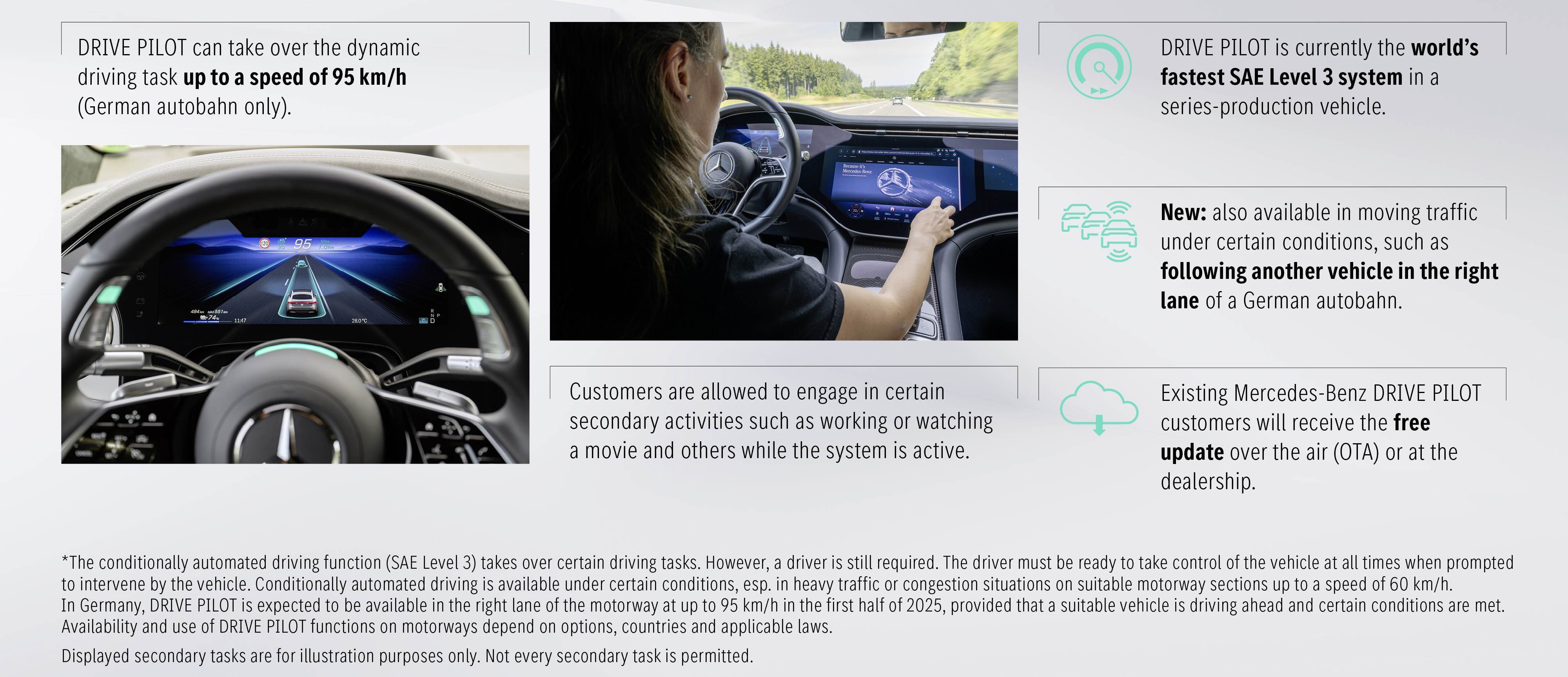 This update makes DRIVE PILOT the fastest certified system for conditionally automated driving (SAE‑Level 3) in a standard production vehicle. Under SAE-Level 3, the automated driving function takes over certain driving tasks. However, a driver is still required. The driver must be ready to take control of the vehicle at all times when prompted to intervene by the vehicle.
