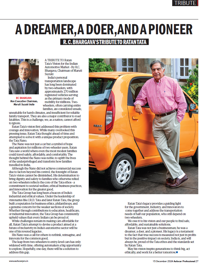 Read heartfelt tributes to automotive icon Ratan Tata from industry legend R C Bhargava and others, honoring Tata’s immense contributions in shaping the Indian automotive landscape.