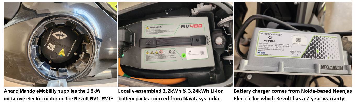 Furthermore, even the electric drivetrain components are localised, thereby enabling the company to achieve a competitive price tag. While the 2.8kW mid-drive electric motor is being locally manufactured and supplied by Anand Group’s EV drivetrain joint venture – Anand Mando eMobility, the lithium-ion battery pack and BMS are locally assembled by Navitasys India at Bawal, Haryana. And the battery charger on the Revolt RV1 and RV1+ is manufactured by the Noida-headquartered Neenjas Electric.