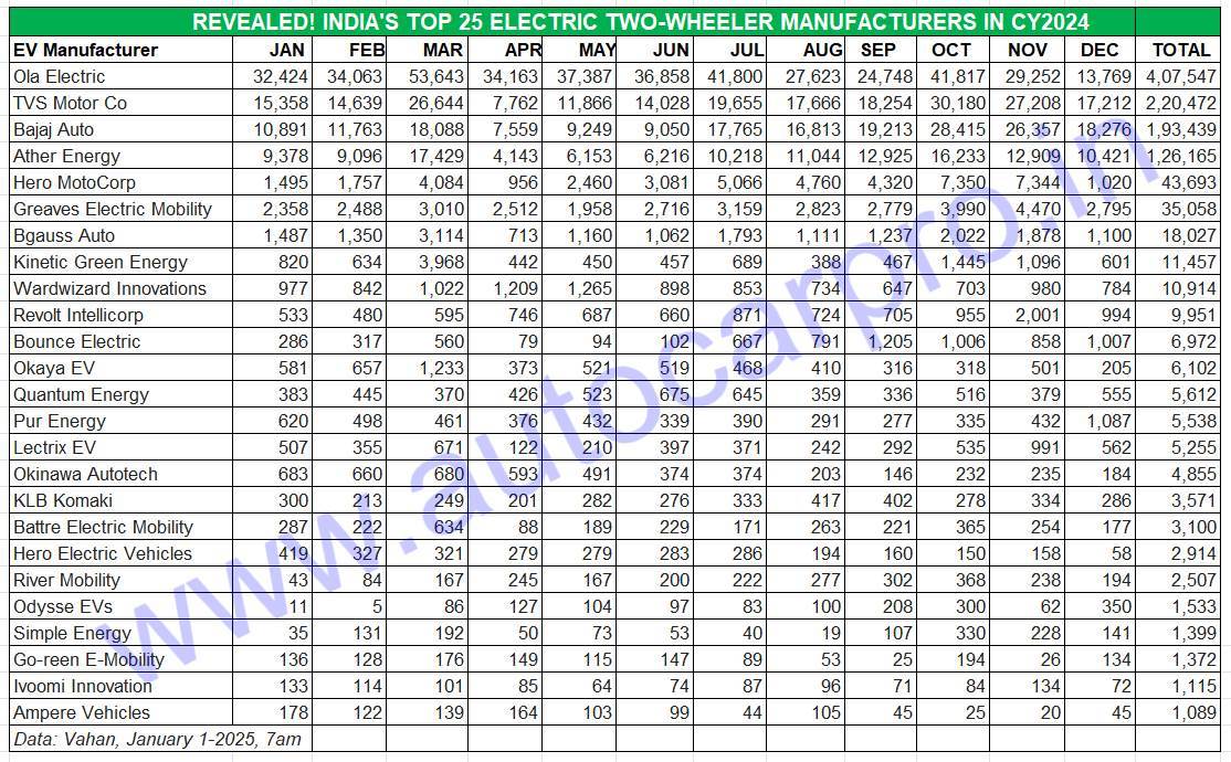 Bajaj Auto, with best-ever annual retail sales of 193,439 Chetaks and 169% YoY growth (CY2023: 71,941 units), unseated CY2023’s No. 3 OEM Ather Energy to take the third rank on the podium. The company not only outsold Ather in each of the past 12 months but has come within biting range of TVS, ending CY2024 27,033 units short of its legacy rival.