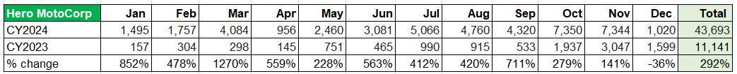 Hero MotoCorp, which is set to enter the electric motorcycle segment next year with a jointly developed midsize performance e-motorcycle with Zero Motorcycles of the USA, registered a near-three-fold YoY increase in its sales of Vida e-scooters in CY2024. At 43,693 units, this marks a 292% YoY increase, albeit on a low year-ago base (CY2023: 11,141 units). October (7,350 units) and November (7,344 units) were the best moths for Vida EV retails in 2024. The much-improved performance is reflected in Hero MotoCorp’s growing market share, which has risen to 4% from 1% in 2023.