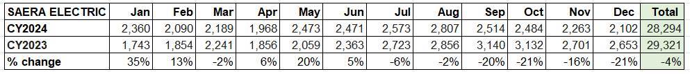 Saera Electric Auto, which manufactures the Mayuri brand of e-rickshaws and e-karts, is ranked fourth in the e3W industry. December with 2,102 units (down 21%) was the sixth month in a row that the company saw its sales decline. Total CY2024 retails at 28,294 units are down 4% YoY (CY2023: 29,321 units) and its market share has reduced to 4% from 5% a year ago. In end-October, the company announced a collaboration with Porter, an on-demand logistics platform to deliver L3 and L5 e-carts. The pilot project will be facilitated in Delhi and Bangalore with the initial projection of delivering 500 vehicles per month in respective cities. The company will be hopeful the strategic partnership gives a fillip to its retails in the months ahead.