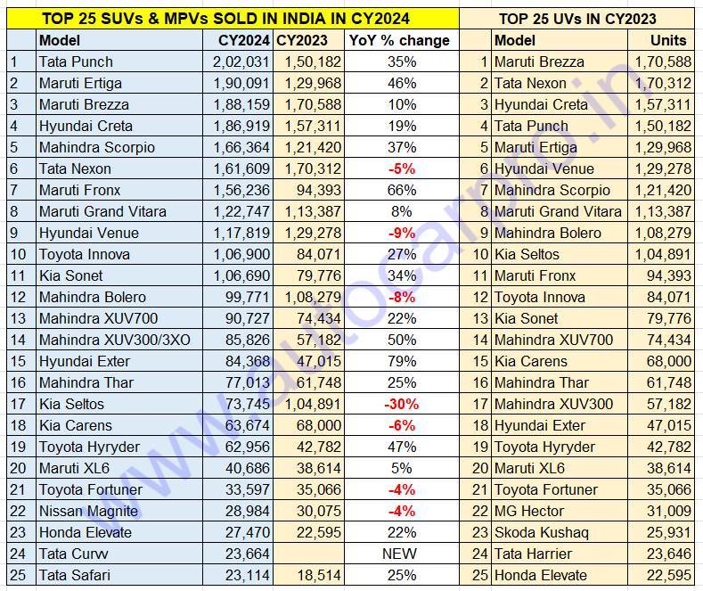 REVEALED: India’s Top 25 SUVs and MPVs in CY2024