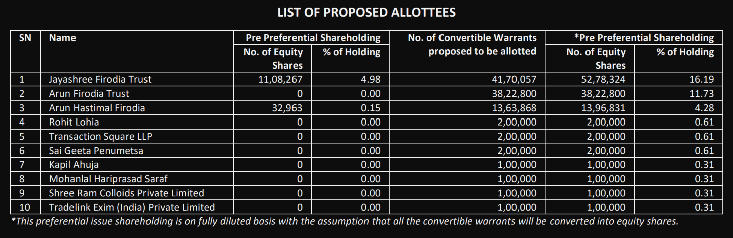 Out of the total 1.04 crore warrants proposed to be issued, 41.7 lakh shares will be issued to Jayashree Firodia Trust, followed by 38.2 lakh warrants to Arun Firodia Trust and 13.6 lakh warrants to Arun Hastimal Firodia. Several private entities will also subscribe to warrants, including Transaction Square LLP and Sai Geeta Penumetsa.