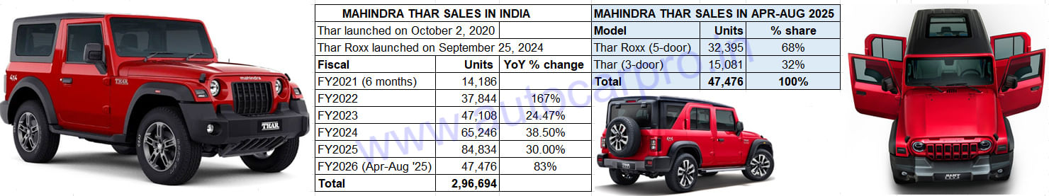 By the end of August 2025, the Thar and the Thar Roxx have clocked sales of 296,694 units. The minuscule gap of 3,306 units to hit 300,000 units would have been bridged in the first week of September.