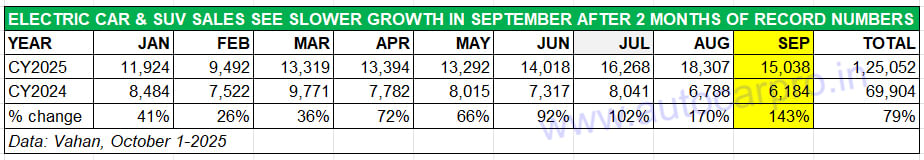 While September 2025 sales of 15,038 units constitutes strong 143% YoY growth per se, month on month, they are down 18% on August (18,324 units) and by 8% on July (16,286 units).