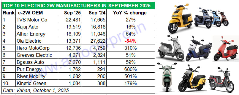 Ather Energy is maintaining its strong growth that it has displayed from the start of the year with a 17% market share last month. The smart e-scooter maker delivered 18,109 units, up 64% YoY (September 2024: 11,046 units). This also makes September 2025 Ather’s best sales month since its market entry in CY2018, beating the previous best of 18,069 units in August 2025. Its flagship Rizta family e-scooter, which surpassed 100,000 wholesale units 13 months after its launch in April, remains Ather’s key growth driver and currently contributes over 60% of its sales each month. This is noteworthy given that the three-variant flagship scooter is a premium product that stands out from the crowd.