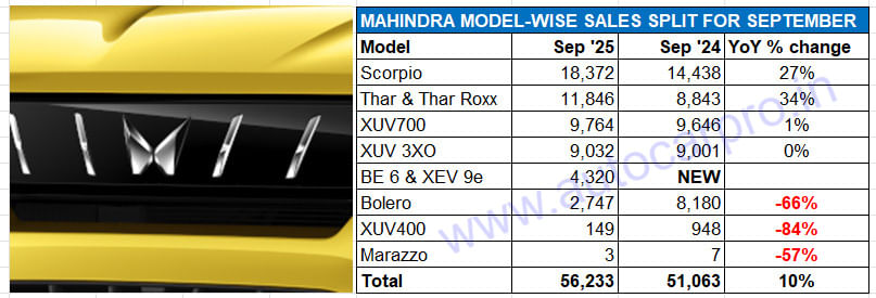 Mahindra & Mahindra, which registered its best-ever monthly wholesales of 56,233 units in September 2025, up 10% YoY (September 2024: 51,062 units), saw factory dispatches of the Scorpio and Thar, its top two current best-selling SUVs, grow their share of total monthly sales to over 50 percent.
