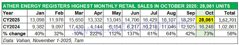 Bengaluru-based smart electric scooter startup Ather Energy, which is having a stellar run in domestic market, has clocked record monthly retail sales of 28,061 units in October 2025 as per Vahan. This is a handsome 73% YoY increase (October 2024: 16,248 units) and makes last month the company’s best ever since it entered the e-2W market in end-CY2018 (see 10-month sales data table below).