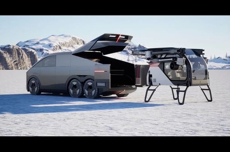 The Land Carrier comprises two modules — a land vehicle and an aerial vehicle — that can be detached and reconnected. The ground-based “mother vehicle” uses a three-axle, six-wheel configuration with all-wheel drive and rear-wheel steering, giving it both off-road capability and load-carrying strength. At around 5.5 metres long, 2 metres wide, and 2 metres tall, the road-going module fits into a standard parking space and can be driven with a regular license. The flying module, made of carbon-fibre composites, features a six-rotor, dual-ducted layout for improved lift and stability, coupled with a 270-degree panoramic cockpit for enhanced visibility.