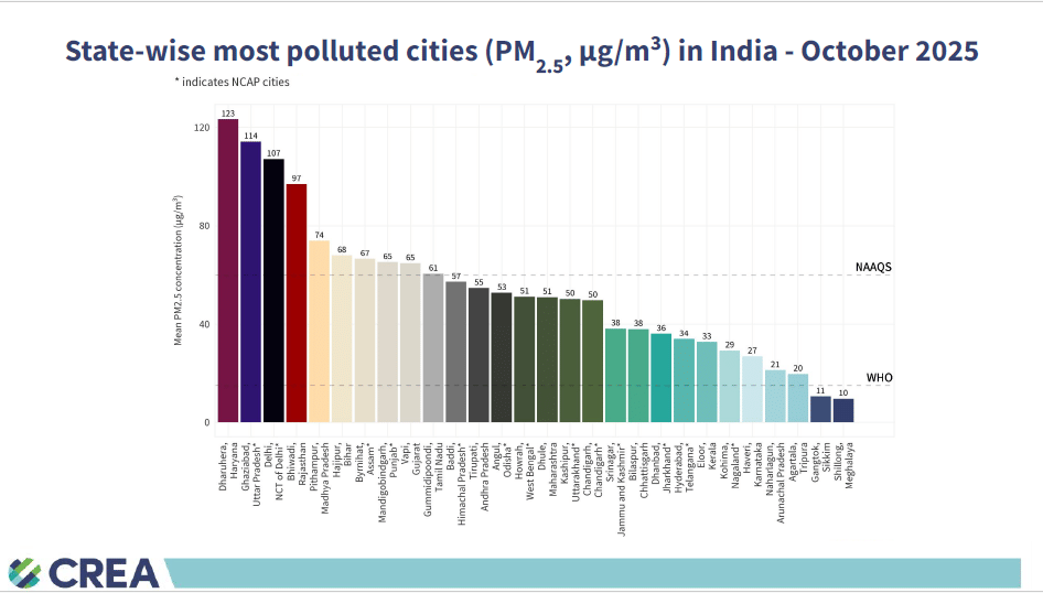 Dharuhera in Haryana emerged as India’s most polluted city in October 2025, recording a monthly average PM2.5 concentration of 123 μg/m³ and breaching the National Ambient Air Quality Standard limit on 77% of days. The city recorded two ‘Severe’ and nine ‘Very Poor’ days during the month.