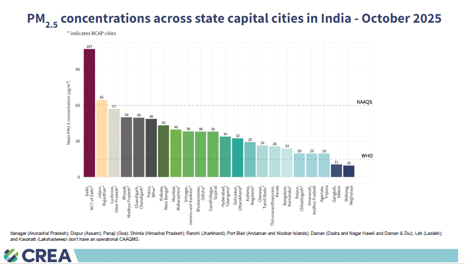 The Centre for Research on Energy and Clean Air (CREA) released its October 2025 Monthly Air Quality Snapshot, revealing sharp deterioration in air quality across India, with pollution concentrated in the Indo-Gangetic Plain, particularly the National Capital Region (NCR), based on data from continuous ambient air quality monitoring stations.