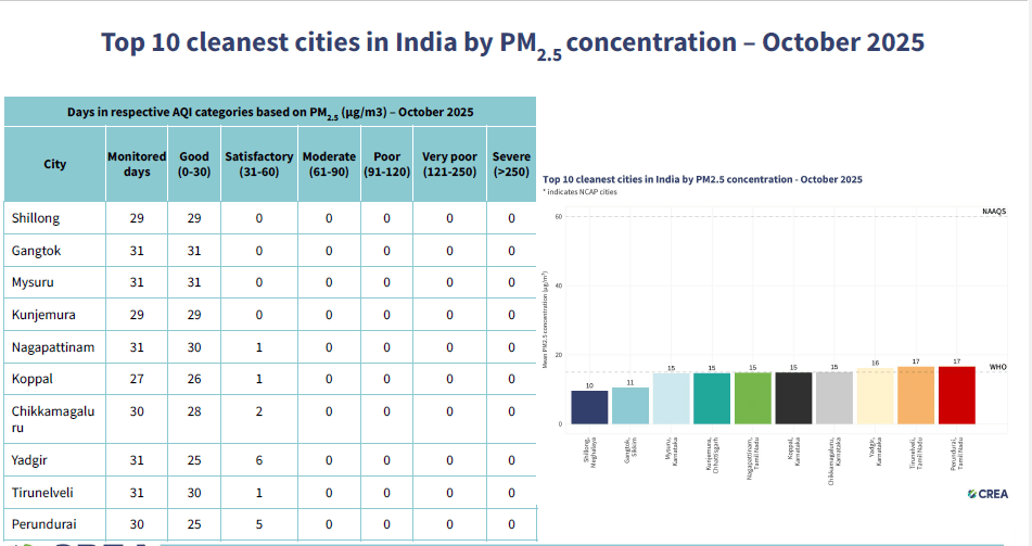 Shillong in Meghalaya was India’s cleanest city in October with an average PM2.5 concentration of 10 μg/m³. The top 10 cleanest cities included four from Karnataka, three from Tamil Nadu, and one each from Meghalaya, Sikkim, and Chhattisgarh.