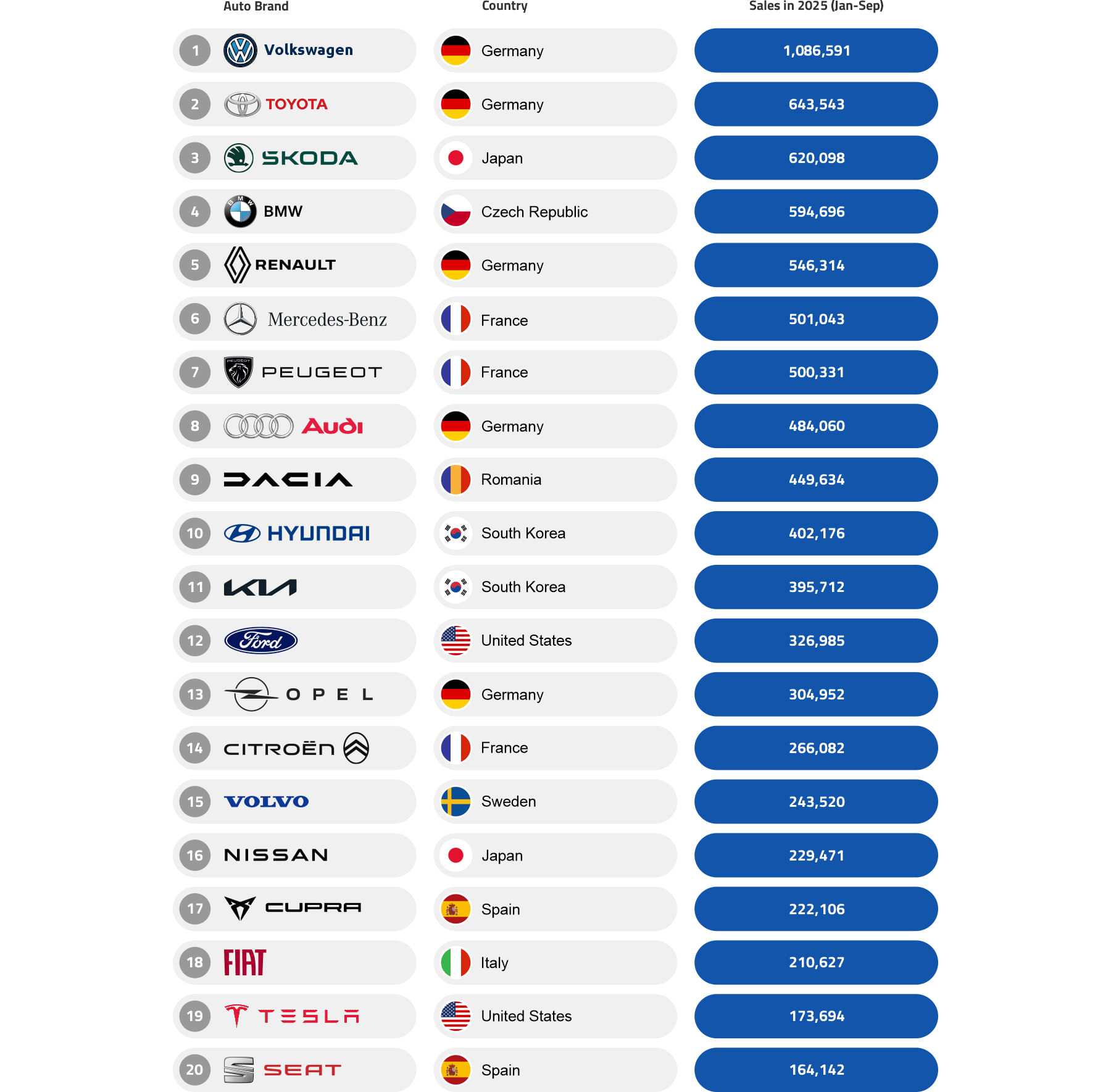 Meanwhile, Asian manufacturers continue to hold significant ground, with Toyota, Hyundai, Kia, and Nissan securing influential positions in the rankings. Yet, perhaps, the most striking narrative is Tesla’s relative underperformance: the brand long synonymous with the EV revolution lands only in 19th place, with 173,694 units. The contrast underscores a fundamental shift in the European market: scale, production networks, and established consumer trust are proving decisive, positioning legacy automakers, rather than EV newcomers, as the true architects of the continent’s electric future.