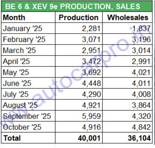 The 4,916 units produced in October take cumulative 10-month production of the Be 6 and XEV 9e to 40,001 units. Monthly domestic sales of the two e-SUVs hit a new high of 4,842 units.