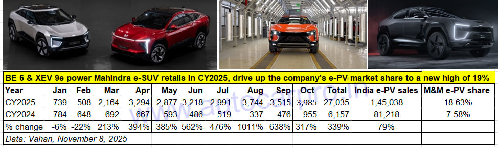 Total M&M e-SUV sales comprising the Be 6, XEV 9e and XUV400 at 27,035 units are up by a massive 339% YoY albeit on a low year-ago base (October 2024: 6,157 units). This translates into an additional 20,878 e-SUVs sold, with the majority being the two Born Electric SUVs.