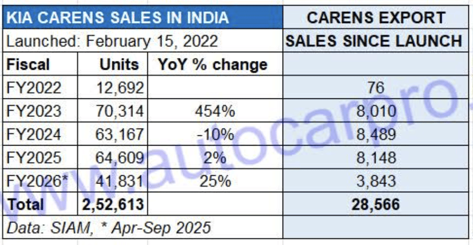 FY2023 with 70,314 units was the Carens’ best fiscal to date. With 41,831 units sold between April-September 2025, FY2026 bids fair to be the best yet for the three model-lineup Carens.