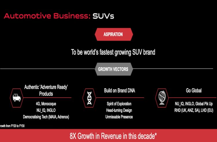 The company is targeting automotive revenue of ₹2.27 lakh crore by FY30, up sharply from ₹28,408.63 crore in FY20, reflecting one of the strongest decade-long expansion plans in India’s automotive industry. The target implies a 23% CAGR, supported by global-ready architecture, a deeper SUV portfolio, and entry into new international markets.