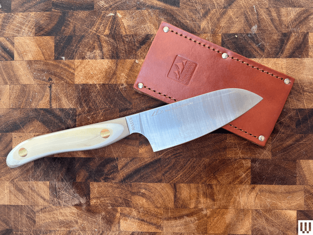 The blade on this USA-made, 5-inch chopper is constructed from particle metallurgy steel, a popular choice for chefs because it stays sharp, keeps an edge well, is stain-resistant, and is generally super tough. The blade is seamlessly integrated into the handle for more balance, and the handle is made of a nearly indestructible aerospace-grade, fiberglass-epoxy composite material available in several stylish colorways (so you can personalize it for the person you’re gifting it to). Plus, it comes with a beautiful leather sheath for safer storage.
