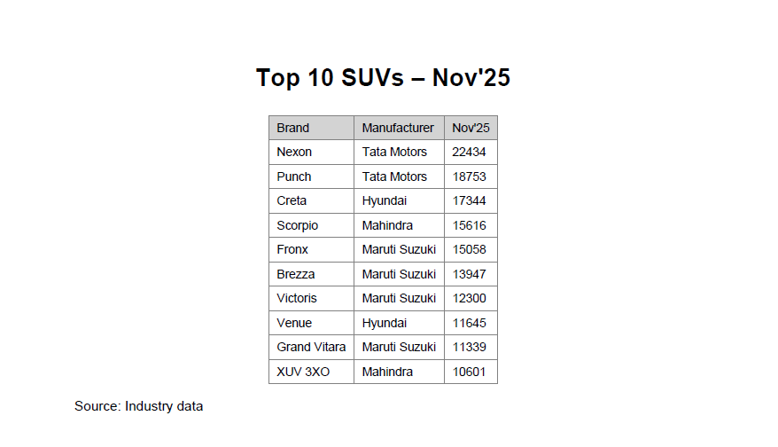 Tata Motors Passenger Vehicles Ltd, the newly renamed passenger vehicle arm of Tata Motors following the October 2025 demerger, strengthened its position in the Indian market in November by securing the top two spots in the SUV segment. The Nexon and Punch finished as the best selling SUVs of the month. The Nexon posted 22,434 units and the Punch followed with 18,753 units. This result further consolidates TMPV’s influence in the fast growing compact SUV category.