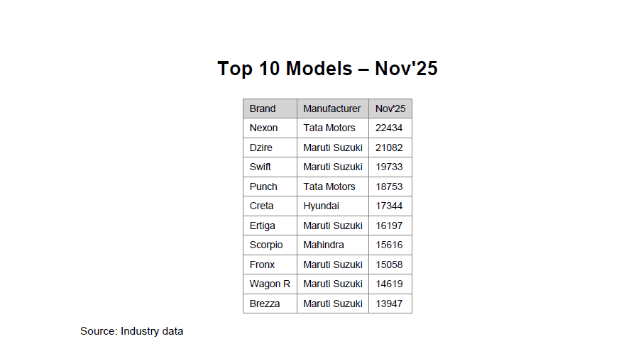TMPV’s strength in the SUV category was clearly reflected in the overall passenger vehicle rankings. The Nexon finished as India’s best selling passenger vehicle in November. Maruti Suzuki’s Dzire with 21,082 units and the Swift with 19,733 units followed. The Punch finished fourth in the all India passenger vehicle chart.