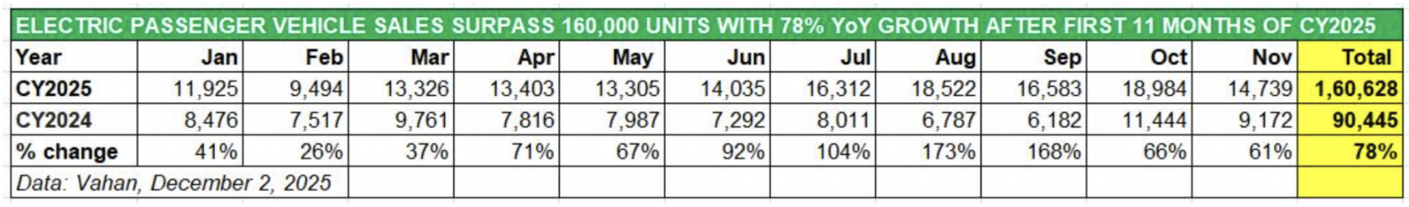 The electric passenger vehicle (e-PV) industry, which comprises zero-emission hatchbacks, sedans, SUVs and MPVs, has delivered a record 160,740 units between January and November 2025. This marks handsome 78% YoY growth (January-November 2024: 90,445 units) and translates into an additional 61,046 e-PVs with December retail sales yet to be counted.