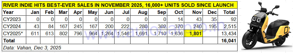 In November 2025, Bengaluru-based electric scooter start-up River Mobility, which is witnessing growing demand for its sole product – the River Indie – registered its highest-ever monthly retail sales – 1,801 units – a little over two years since launch. In the past 11 months, the River Indie has been part of the Top 10 listing seven times – April, June, July, August, September, October and November. That’s not all.